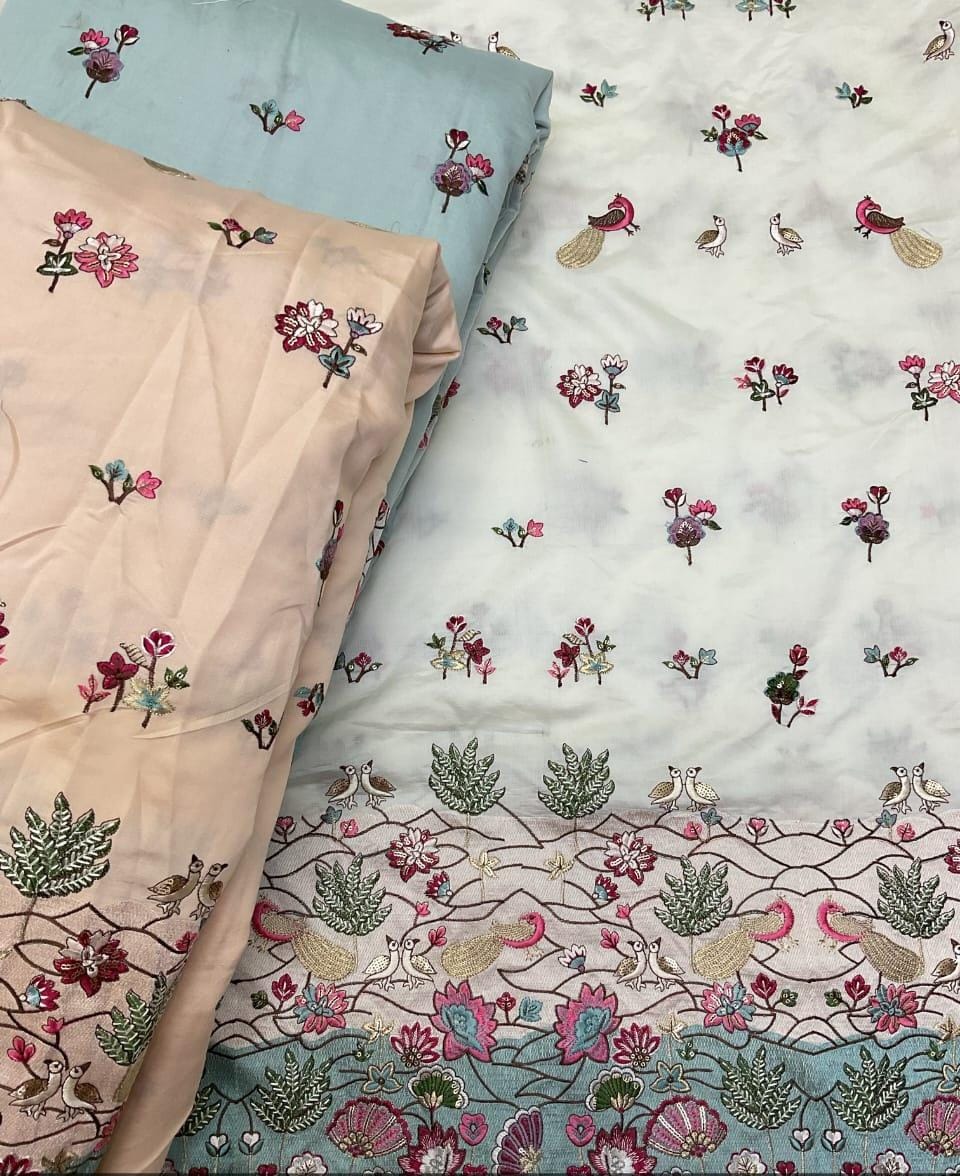 Silk Ethnic Wear Fabric for men and women. It can be used to make heavy clothing for soecial occasions. The fabric is silk based and has heavy embroudery work on it which gives it a rich look